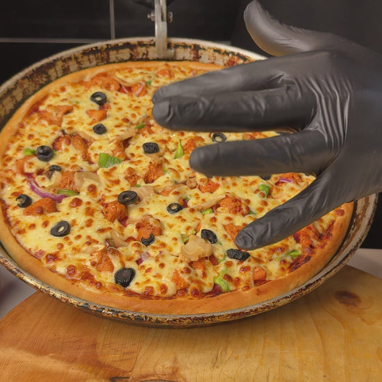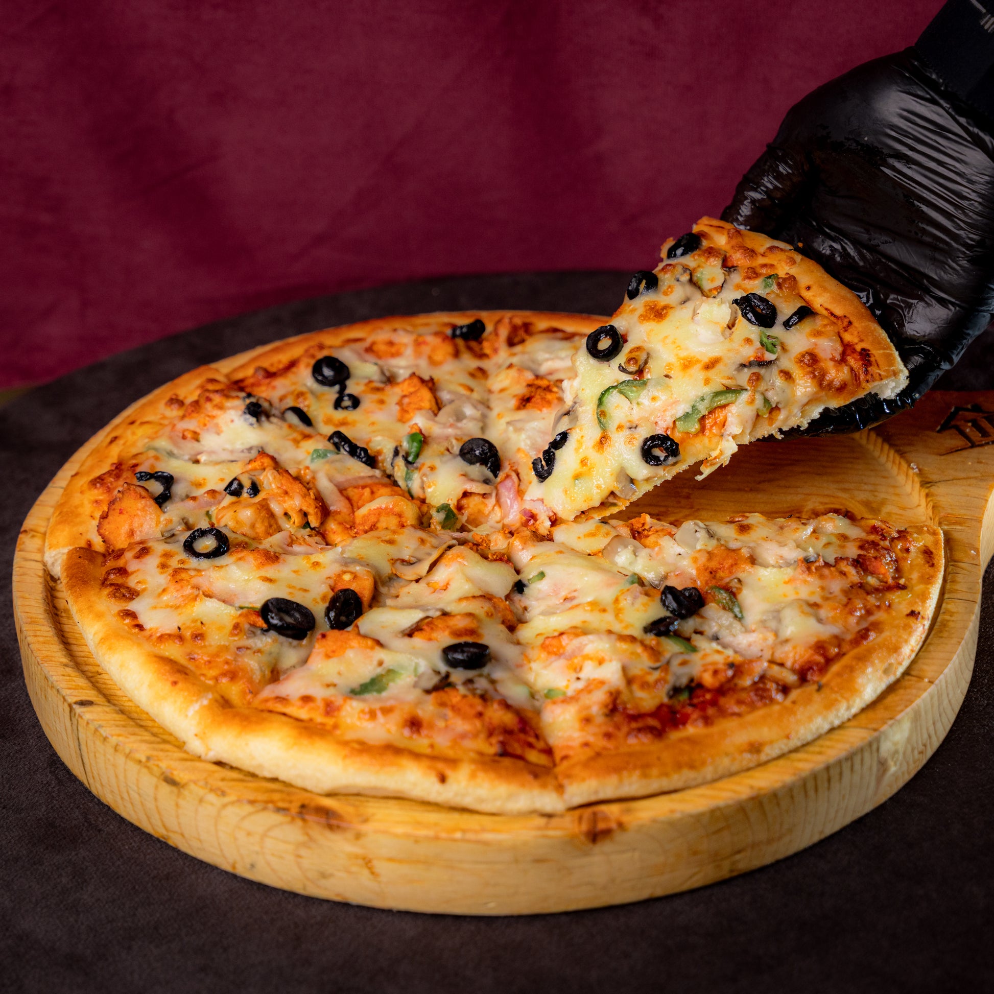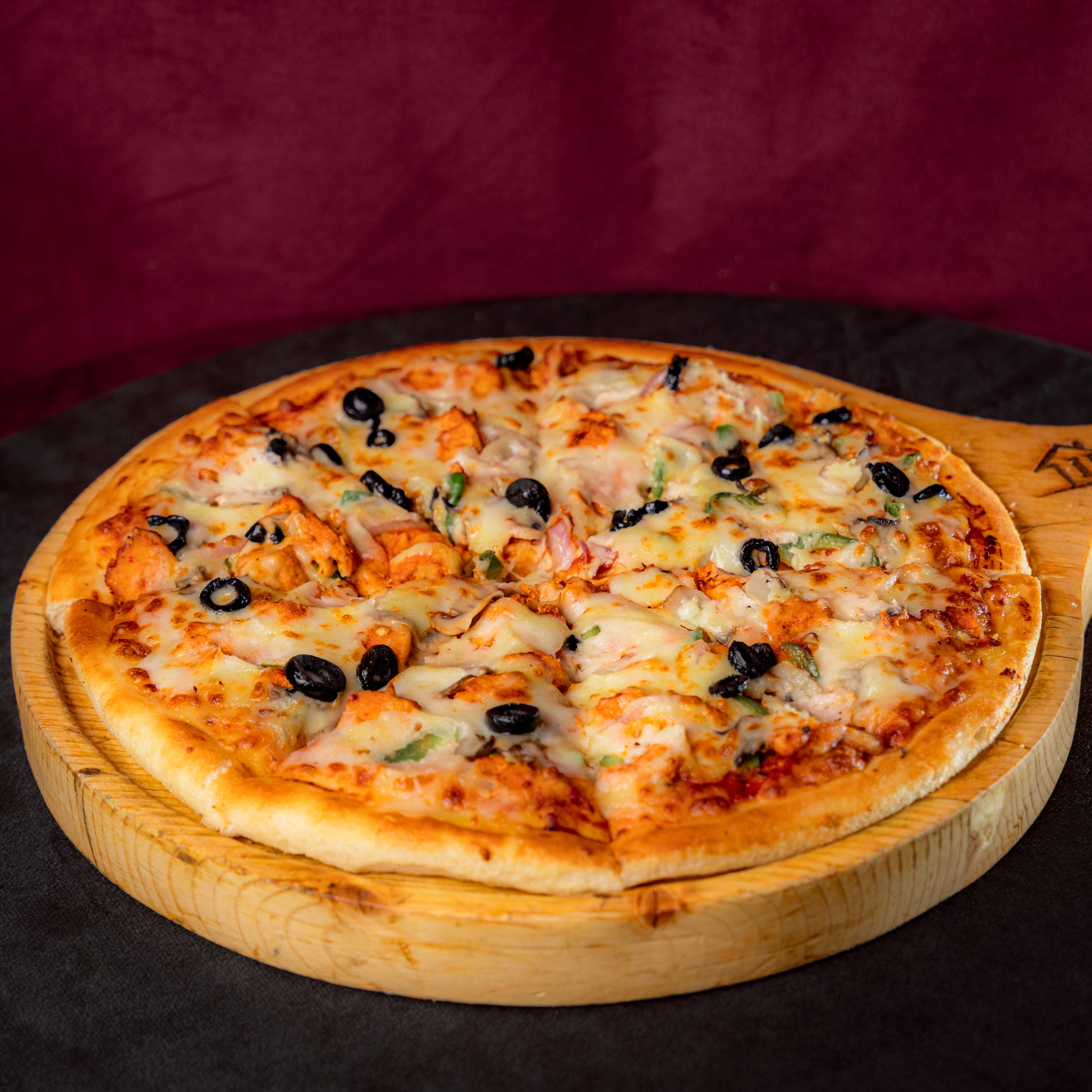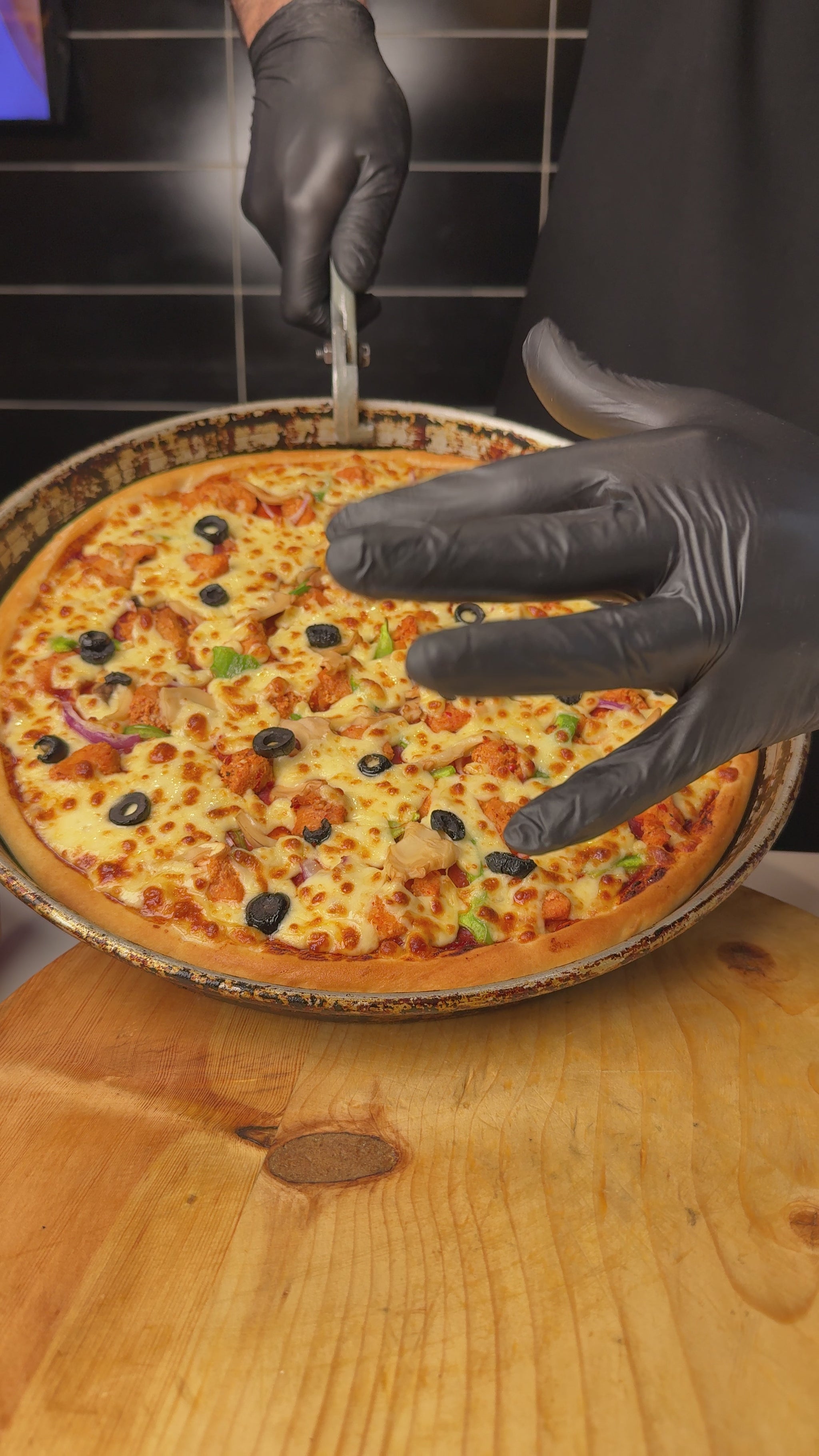 Spicy chicken, fajita chicken, onions, green peppers, olives, and mushrooms!